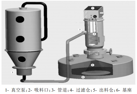 目前國內(nèi)外都有著許多成熟的真空輸送機,德國一公司設計的真空輸送機,創(chuàng)新地加入稱重和計量裝置,能夠保證更精確的稱重,其結(jié)構(gòu)如下圖所示,該系統(tǒng)解決了當前食品、醫(yī)療等企業(yè)輸送物料過程中存在的計量不準確問題,并能夠根據(jù)稱重裝置的結(jié)果更為準確地計算出輸送過程中關閉真空泵或中斷吸入過程的時間點。