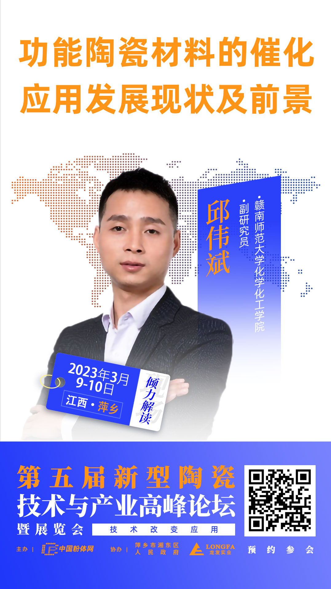 2023年3月9-10日,中國粉體網(wǎng)將在江西萍鄉(xiāng)舉辦“第五屆新型陶瓷技術(shù)與產(chǎn)業(yè)高峰論壇”,我們有幸邀請到贛南師范大學(xué)的邱偉斌副研究員作題為《功能陶瓷材料的催化應(yīng)用發(fā)展現(xiàn)狀及前景》的報(bào)告。報(bào)告中,邱偉斌副研究員將結(jié)合當(dāng)前發(fā)展現(xiàn)狀、不足及他們的研究基礎(chǔ),對功能陶瓷材料在催化領(lǐng)域的發(fā)展趨勢進(jìn)行展望,以期為研制高活性、高穩(wěn)定性且低成本的光/電小分子轉(zhuǎn)換催化劑提供參考。