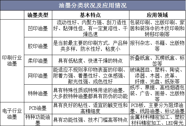 按照應(yīng)用場景的不同,油墨材料可分為印刷行業(yè)油墨和電子行業(yè)油墨。其中,按照印刷方式,印刷油墨分為凹印油墨、膠印油墨、柔印油墨、網(wǎng)印油墨和特種油墨,主要應(yīng)用于各類別印刷物和塑料陶瓷等;電子油墨分為PCB油墨和特種功能性油墨,主要應(yīng)用于PCB板、金屬材料和塑膠材料精密加工、LED背光等。