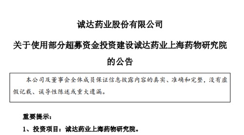 中國粉體網(wǎng)訊 12月28日,誠達(dá)藥業(yè)發(fā)布公告,根據(jù)公司的發(fā)展規(guī)劃及實(shí)際研發(fā)需要,公司擬使用部分超募資金購買位于上海市臨港奉賢園區(qū)D0205地塊的臨港智造園十一期項(xiàng)目6號(hào)廠房用于建設(shè)誠達(dá)藥業(yè)上海藥物研究院。本次擬購買的房產(chǎn)規(guī)劃建筑面積為8,058.82平方米(最終以臨港智造園十一期項(xiàng)目不動(dòng)產(chǎn)權(quán)證書記載面積為準(zhǔn)),截至目前臨港智造園十一期項(xiàng)目尚在施工階段且未竣工驗(yàn)收。