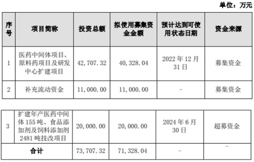 經(jīng)中國證券監(jiān)督管理委員會(huì)《關(guān)于同意誠達(dá)藥業(yè)股份有限公司首次公開發(fā)行股票注冊(cè)的批復(fù)》(證監(jiān)許可[2021]3857號(hào))同意注冊(cè),公司首次公開發(fā)行人民幣普通股(A股)股票24,174,035股,發(fā)行價(jià)格為每股72.69元,募集資金總額為175,721.06萬元,扣除發(fā)行費(fèi)用共計(jì)13,576.31萬元(不含稅)后,募集資金凈額為162,144.75萬元。公司公開發(fā)行股票募集資金(含超募資金)擬投資于以下項(xiàng)目: