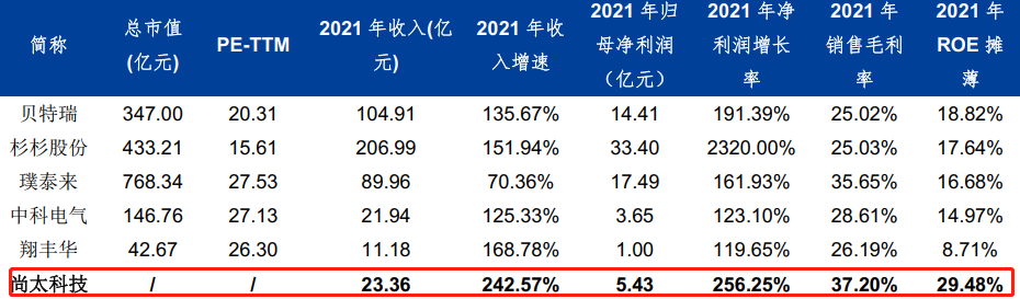 尚太科技與同行業(yè)公司指標(biāo)對(duì)比