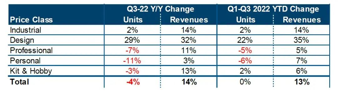 △全球3D打印機(jī)系統(tǒng)出貨量及收入變化(按價(jià)格等級(jí)劃分為工業(yè)級(jí)、設(shè)計(jì)級(jí)、專業(yè)級(jí)、個(gè)人級(jí)、套件及個(gè)人愛好)。2022年第三季度與2021年第三季度對(duì)比;2022年第三季度與第一季度對(duì)比。