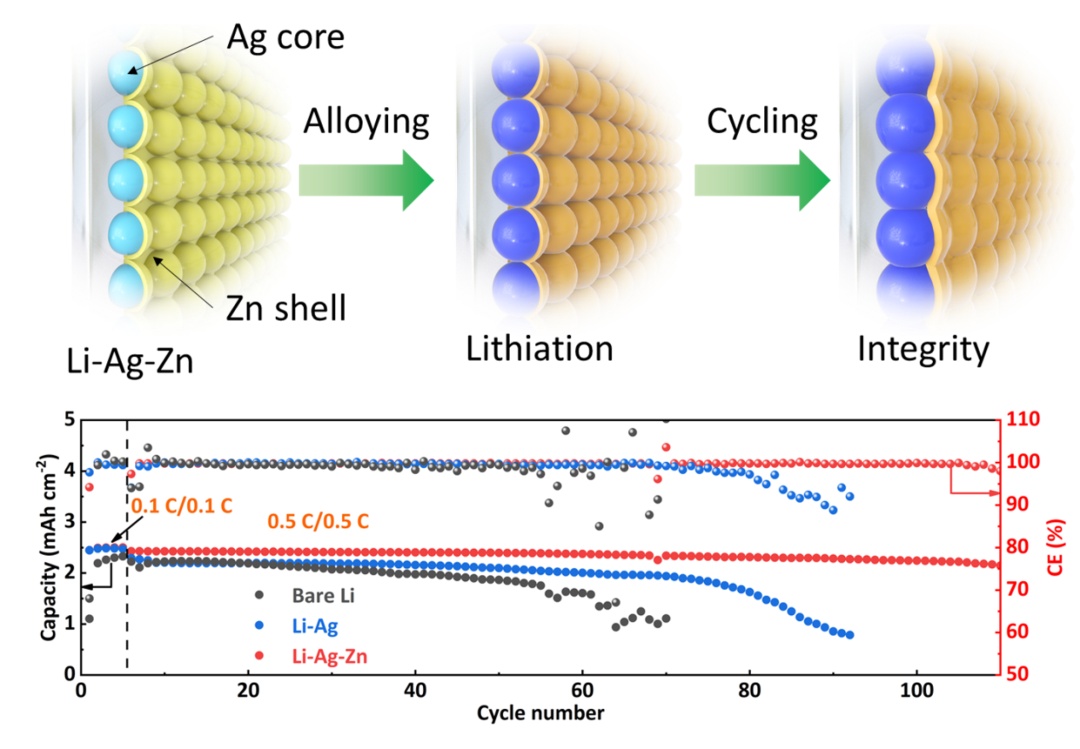 近日,中科院寧波材料所姚霞銀研究員、彭哲研究員與華南理工大學(xué)劉軍教授提出雙合金界面的鋰金屬負(fù)極改善策略,構(gòu)筑了以銀作為親鋰內(nèi)核和鋅作為擴(kuò)散外層的微結(jié)構(gòu)合金界面,顯著改善了親鋰性合金界面的結(jié)構(gòu)穩(wěn)定性和鋰保護(hù)長(zhǎng)效性。