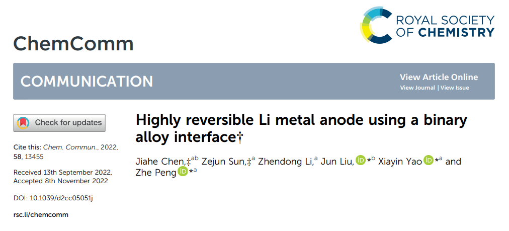 該工作以“Highly reversible Li metal anode using a binary alloy interface”(《雙合金界面助力高可逆鋰金屬負(fù)極》)為題發(fā)表在國(guó)際期刊Chemical Communication上。華南理工大學(xué)材料科學(xué)與工程學(xué)院博士生陳家和與中科院寧波材料所孫澤鈞(現(xiàn)新加坡國(guó)立大學(xué)博士生)為本文共同第一作者。