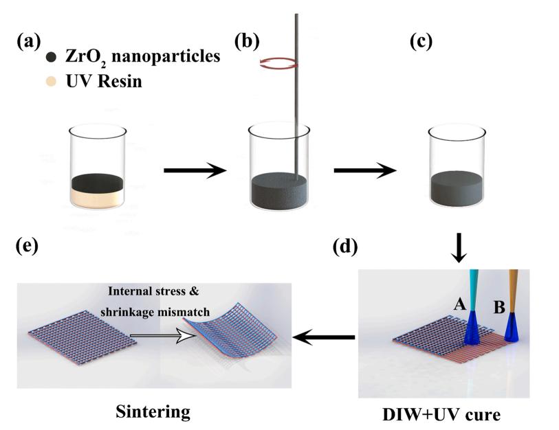 采用直寫-燒結(jié)法進(jìn)行陶瓷結(jié)構(gòu)的4D打印。(a)將ZrO2納米顆粒與UV樹脂按不同比例混合。(b-c)含有均勻分散的ZrO2納米顆粒的UV材料墨水。(d)采用雙噴嘴配備DIW技術(shù)并進(jìn)行UV固化處理的陶瓷片3D打印。(e)將3D打印的陶瓷片燒結(jié)后轉(zhuǎn)化為4D打印的陶瓷結(jié)構(gòu)。