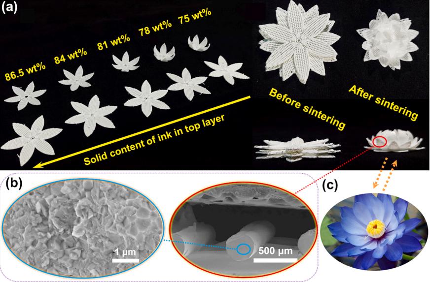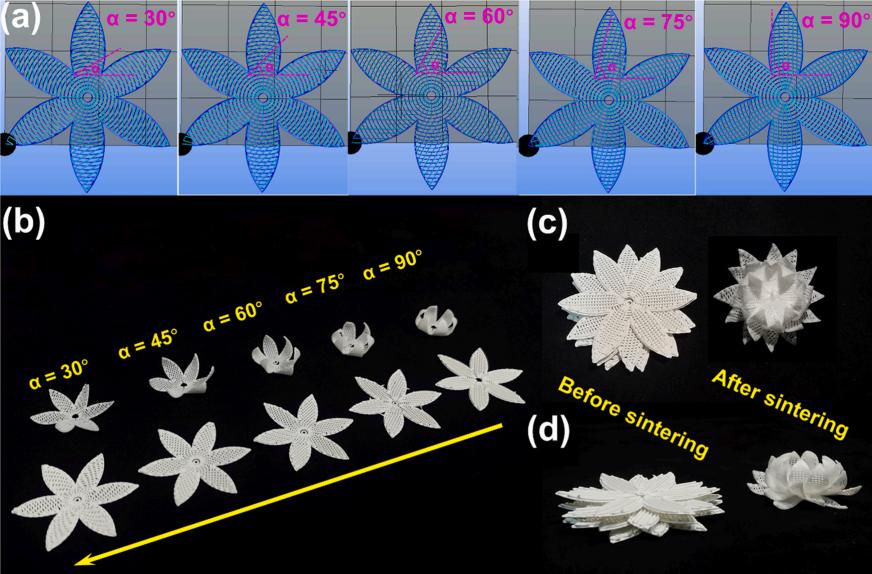 該研究主要利用打印陶瓷在燒結(jié)過程中的應(yīng)力不匹配,以達(dá)成陶瓷結(jié)構(gòu)的4D打印。科研團(tuán)隊(duì)通過打印底層高固含量、頂層低固含量的雙層氧化鋯(ZrO2)陶瓷,令其燒結(jié)收縮率的內(nèi)應(yīng)力的方向與低收縮率材料的軸向方向一致,實(shí)現(xiàn)其形狀由平面變?yōu)閺澢Y(jié)構(gòu)。在這一過程中,研究人員通過選擇不同的打印工藝來定制陶瓷結(jié)構(gòu)的變形行為。最后,通過對陶瓷材料的固含量和打印路徑進(jìn)行編程,實(shí)現(xiàn)了具有各種特性的4D打印陶瓷花朵。