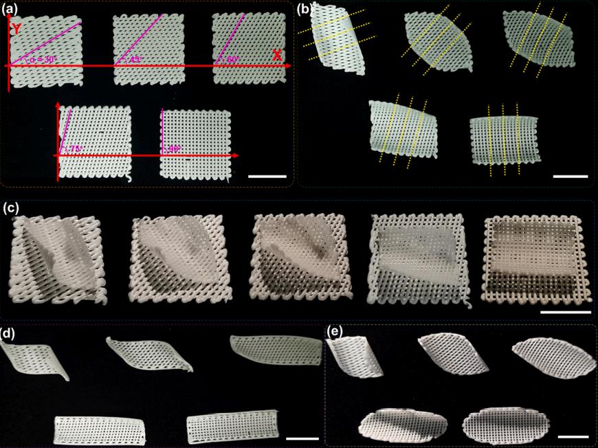 燒結(jié)過程中陶瓷雙分子層的自變形。(a)以不同的路徑打印雙層陶瓷方塊。(b)燒結(jié)后雙層陶瓷方塊的形狀變化。(c)陶瓷方塊燒結(jié)前后的對比。(d)燒結(jié)后雙層陶瓷矩形的幾何形狀。(e)燒結(jié)后雙層陶瓷橢圓的幾何形狀。比例尺為10mm。