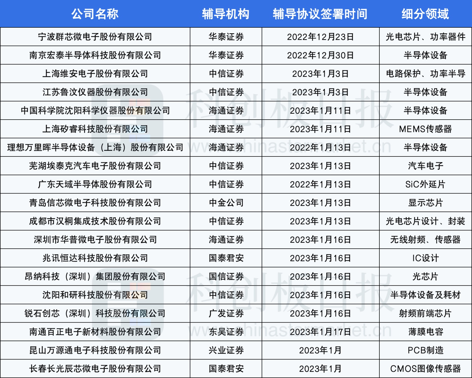 2023年開年以來,已有埃泰克、天域股份、沈陽科儀、長光辰芯、矽?萍、華普微電子、信芯微等近20家半導體領域廠商披露了上市輔導備案情況,涵蓋汽車電子、半導體材料、半導體設備及部件、光芯片、功率器件、PCB制造、封裝等眾多細分領域。