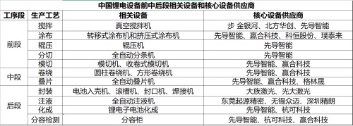 國(guó)內(nèi)前段核心設(shè)備供應(yīng)商包括先導(dǎo)智能、贏合科技、科恒股份和璞泰來(lái)等。中段核心設(shè)備供應(yīng)商包括先導(dǎo)智能、贏合科技等,主要供應(yīng)卷繞機(jī)、疊片機(jī)和焊接機(jī)等,格林晟也為疊片工序所需設(shè)備的核心供應(yīng)商。后段核心設(shè)備供應(yīng)商包括先導(dǎo)智能、杭可科技等,主要供應(yīng)化成和分容檢測(cè)所需相關(guān)設(shè)備(鋰電子電池化成和分容柜等),其中先導(dǎo)智能主要供應(yīng)寧德時(shí)代,杭可科技主要供應(yīng)LG。
