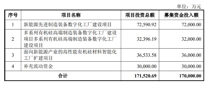 中國(guó)粉體網(wǎng)訊 1月20日,金銀河(300619)發(fā)布募集說明書(申報(bào)稿),公司本次向特定對(duì)象發(fā)行募集資金總額不超過17億元,擬用于新能源先進(jìn)制造裝備數(shù)字化工廠建設(shè)項(xiàng)目、多系列有機(jī)硅高端制造裝備數(shù)字化工廠建設(shè)項(xiàng)目及面向新能源產(chǎn)業(yè)的高性能有機(jī)硅材料智能化工廠擴(kuò)建項(xiàng)目和補(bǔ)充流動(dòng)資金項(xiàng)目。