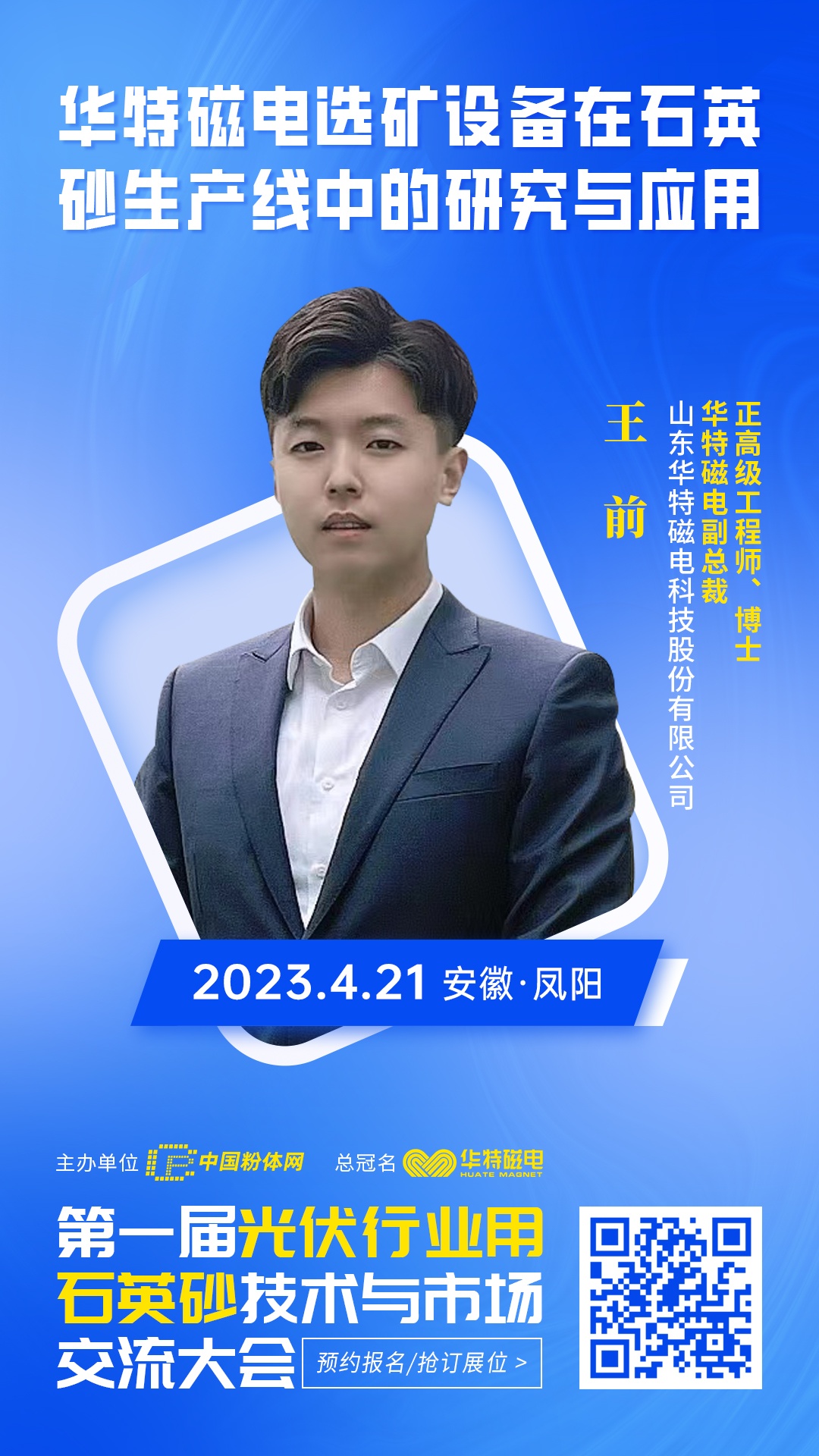 2023年4月21日,中國(guó)粉體網(wǎng)將在安徽鳳陽(yáng)舉辦“第一屆光伏行業(yè)用石英砂技術(shù)與市場(chǎng)交流大會(huì)”。華特磁電副總裁、正高級(jí)工程師、博士王前將帶來(lái)題為《華特磁電選礦設(shè)備在石英砂生產(chǎn)線中的研究與應(yīng)用》的報(bào)告。