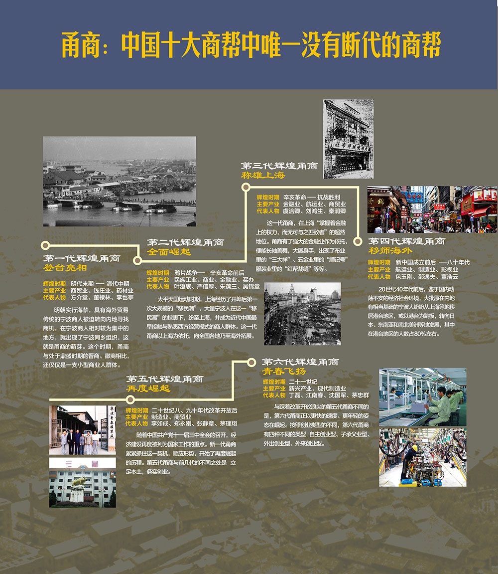 甬,浙江省寧波市的簡(jiǎn)稱,因境內(nèi)有甬江而得名。甬商則是指寧波籍經(jīng)商的人。中國(guó)十大商幫中唯一沒(méi)有斷代的就是甬商。
