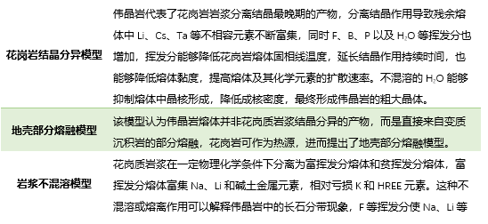 LCT型偉晶巖成因機制一直存在爭論,爭論的成因模型可總結(jié)為三種: