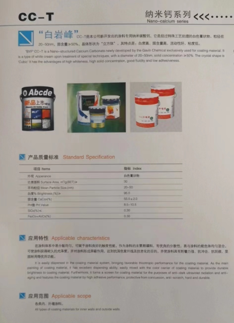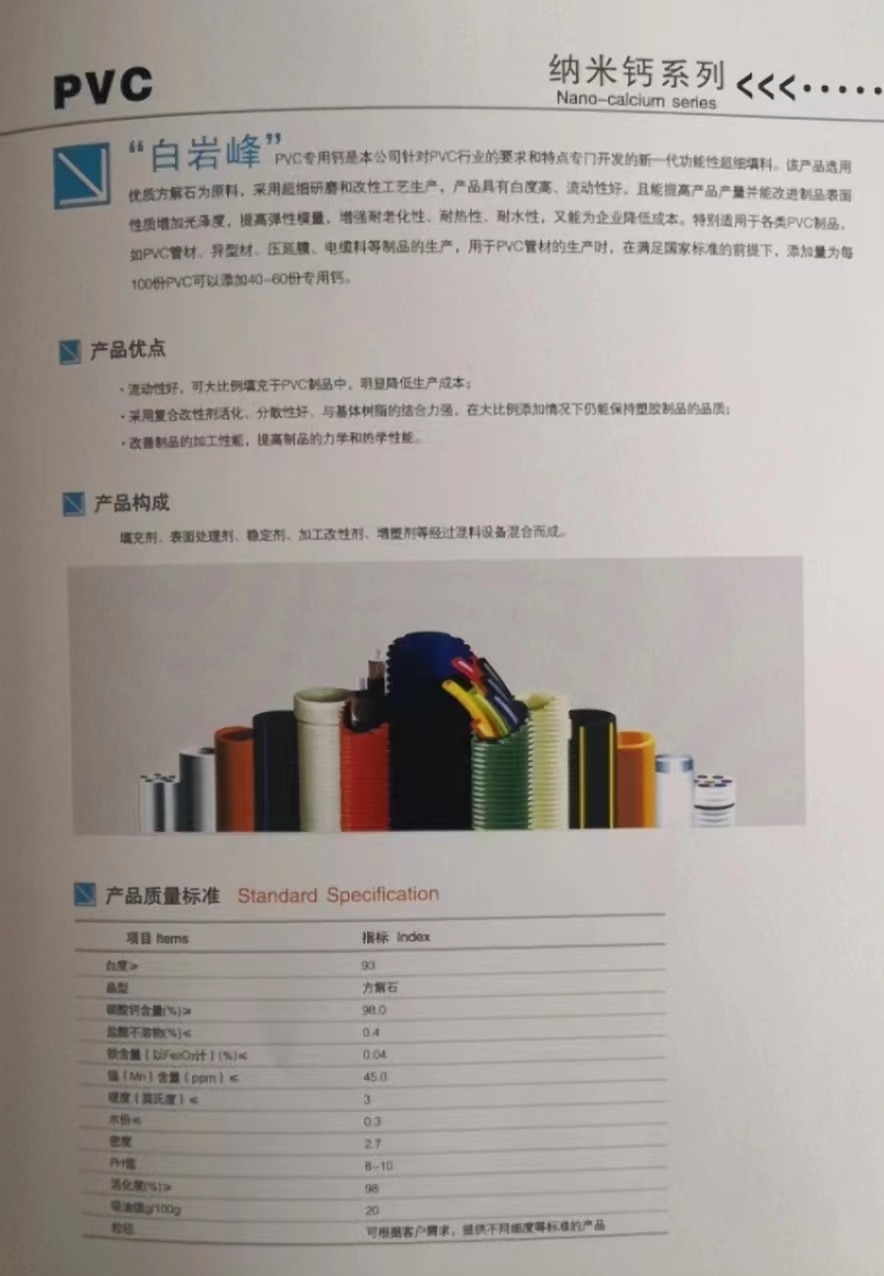 本公司專業(yè)研發(fā)和生產(chǎn)各種復(fù)合粉體專用鈣系列、納米鈣系列、重鈣系列、輕質(zhì)沉淀碳酸鈣系列、輕質(zhì)活性碳酸鈣系列產(chǎn)品,年產(chǎn)量5萬噸。白巖峰牌納米(活性)碳酸鈣系列產(chǎn)品: CC、CC-R、CC-OT超細(xì)重質(zhì)(活性)碳酸鈣系列產(chǎn)品:YF-1000、YF-1250、YF-1500、 YF-2000。所有產(chǎn)品均在生產(chǎn)基地選用優(yōu)質(zhì)石灰石、方解石為基礎(chǔ)原料,并與國內(nèi)外多家科研發(fā)機(jī)構(gòu)進(jìn)行技術(shù)交流與合作,產(chǎn)品具有白度高、化學(xué)性能穩(wěn)定、粒子均勻、分散性強(qiáng)等特點(diǎn),廣泛用于涂料、塑料、橡膠、油墨、密封膠、化纖等工業(yè)領(lǐng)域。