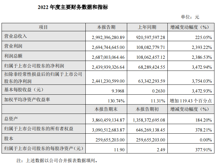 中國粉體網(wǎng)訊 3月14日,融捷股份發(fā)布業(yè)績快報(bào)。根據(jù)公告,2022年融捷股份實(shí)現(xiàn)營業(yè)總收入約29.92億元,同比增長225.05%;歸屬于上市公司股東的凈利潤約24.4億元,同比增長3472.94%;扣除非經(jīng)常性損益后的歸屬于上市公司股東的凈利潤24.41億元,同比增長3754.03%;公司基本每股收益約9.4元,同比增長3472.93%。