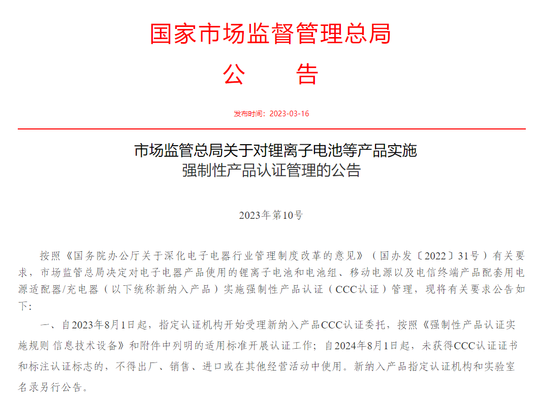 中國粉體網(wǎng)訊 3月16日,國家市場監(jiān)督管理總局發(fā)布關于對鋰離子電池等產品實施強制性產品認證管理的公告。市場監(jiān)管總局決定對電子電器產品使用的鋰離子電池和電池組、移動電源以及電信終端產品配套用電源適配器/充電器(以下統(tǒng)稱新納入產品)實施強制性產品認證(CCC認證)管理。