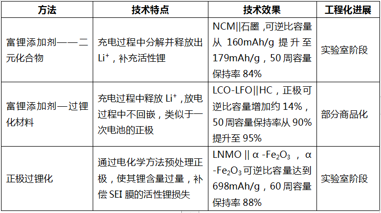 正極預(yù)鋰化是指通過額外添加的活性鋰源,來補(bǔ)償不可逆的活性鋰損失,確保電池內(nèi)活性鋰的充足。相較于流程復(fù)雜、安全風(fēng)險(xiǎn)高,且對(duì)環(huán)境和工藝要求較高的負(fù)極預(yù)鋰化技術(shù),目前研究較多的正極預(yù)鋰化技術(shù)集中在高性價(jià)比的富鋰添加劑開發(fā)方面。