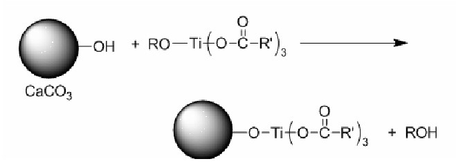 實際應(yīng)用中碳酸鈣與聚乙烯之間要有良好的界面結(jié)合,且碳酸鈣的粒徑要小,分散性要好。因此,碳酸鈣必須進行改性處理。用鈦酸酯偶聯(lián)劑改性碳酸鈣,偶聯(lián)劑中存在的烷基部分在改性過程中易于水解與碳酸鈣表面的-OH結(jié)合,能使碳酸鈣表面性質(zhì)變?yōu)槭杷;另一端的三個結(jié)構(gòu)可以與聚合物發(fā)生纏繞或者化學結(jié)合,從而改善碳酸鈣與高聚物的界面相容性及碳酸鈣在該體系中的流變性和分散穩(wěn)定性,進而提高了復合材料的機械性能和力學性能。