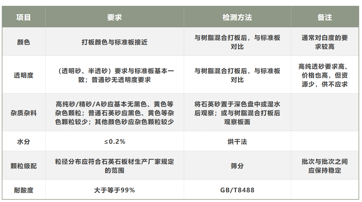 石英砂中雜點數(shù)量以及砂本身的呈色決定了石英砂的品級,雜點多、顏色黃,均會影響制成的石英石板材的質量和檔次。因此,我們將不同品級的石英砂,分為精砂、A砂、普砂、C砂等等。