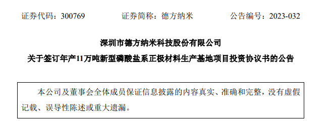 3月29日,德方納米通過《關(guān)于簽訂年產(chǎn)11萬噸新型磷酸鹽系正極材料生產(chǎn)基地項目投資協(xié)議書的議案》,擬與會澤縣人民政府簽訂《年產(chǎn)11萬噸新型磷酸鹽系正極材料生產(chǎn)基地項目投資協(xié)議書》,擬在會澤縣建設(shè)“年產(chǎn)11萬噸新型磷酸鹽系正極材料生產(chǎn)基地項目”,項目用地500目,總投資約25億元,將于兩年內(nèi)完成建設(shè)。