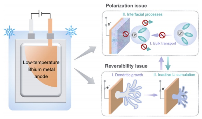 圖1穩(wěn)定低溫金屬鋰負極的主要瓶頸,即極化問題、可逆性問題以及這兩個因素如何相互作用的示意圖。