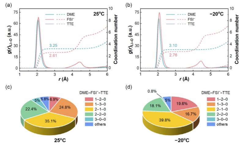 圖3通過MD模擬了具有溫度依賴性的Li+溶劑化結(jié)構(gòu)。根據(jù)(a)25°C和(b)-20°C,通過MD模擬軌跡計算的Li-ODME,Li-OFSI-和Li-OTTE對的徑向分布函數(shù)(實線)和配位數(shù)圖(虛線),(c,d)是不同Li+配位結(jié)構(gòu)的相應(yīng)統(tǒng)計。