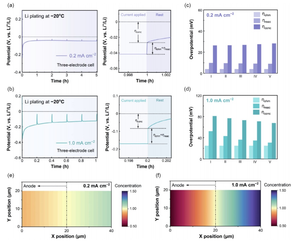 圖4在(a)0.2mAcm-2和(b)1.0mAcm-2下,三電極時間分辨瞬態(tài)弛豫測量對低溫鋰沉積的過電位屬性進行分解在(c)和(d)中得出了不同的的ηohm、ηCT和ηconc在(e)0.2mAcm-2和(f)1.0mAcm-2下沉積1.0mAhcm-2后,電解液中離子濃度梯度的COMSOL模擬結(jié)果。