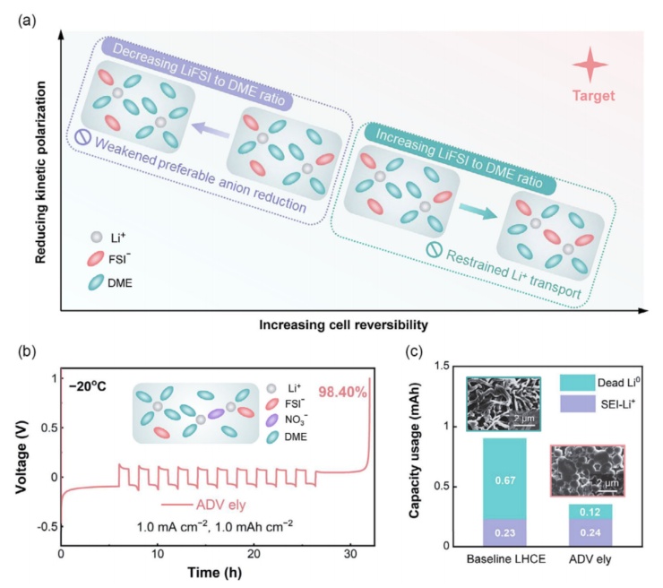 圖6(a)低溫電解質(zhì)設(shè)計的示意圖,同時針對低過電位和高鋰可逆性,其中僅調(diào)節(jié)鋰鹽濃度是無法實現(xiàn)的。(b)利用先進的電解質(zhì)測定Li|Cu半電池的平均CE。該插圖說明了在優(yōu)化電解質(zhì)中形成的典型溶劑化結(jié)構(gòu)。(c)在1.0mAcm-2下進行10個循環(huán)后的非活性Li組成的TGC結(jié)果,插圖是LHCE和ADV電解質(zhì)中各自的Li沉積形態(tài)。