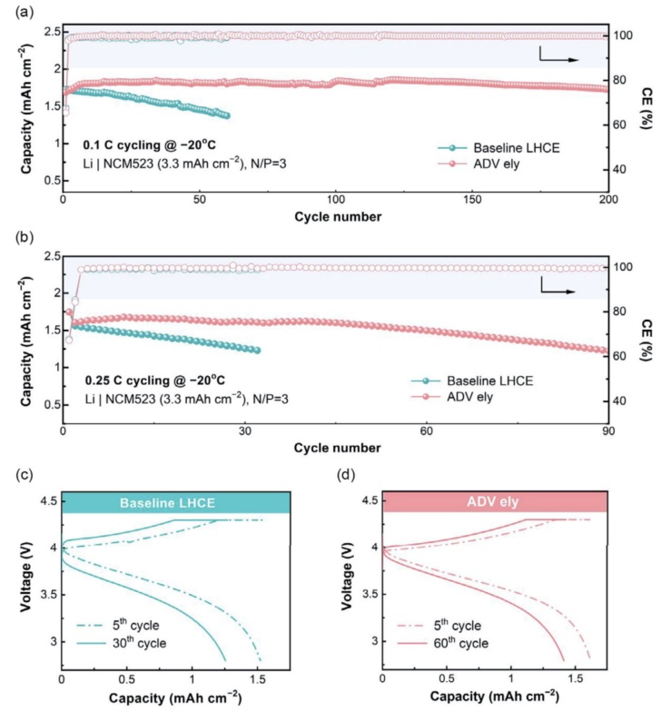 圖7實際的Li|NCM523電池在(a)0.1C和(b)0.25C下循環(huán)的低溫(-20°C)性能,以及使用c)LHCE和d)ADV電解質(zhì)在0.25C下記錄的電壓曲線。