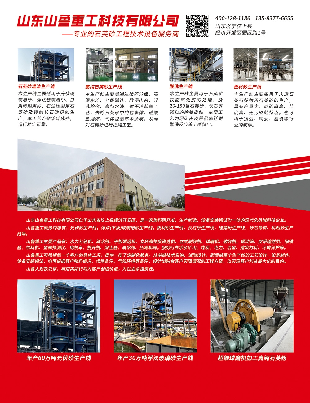 山東山魯重工科技有限公司位于山東省汶上縣經(jīng)濟開發(fā)區(qū),是一家集科研開發(fā)、生產(chǎn)制造、設(shè)備安裝調(diào)試為一體的現(xiàn)代化機械科技企業(yè)。山魯重工服務(wù)內(nèi)容有:光伏砂生產(chǎn)線,浮法(平板)玻璃用砂生產(chǎn)線,板材砂生產(chǎn)線,長石砂生產(chǎn)線,硅微粉生產(chǎn)線,砂石骨料、機制砂生產(chǎn)線等。