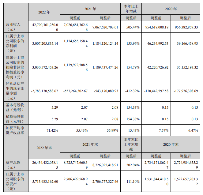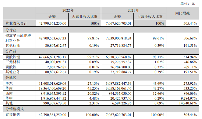 中國(guó)粉體網(wǎng)訊 4月12日,湖南裕能(301358)發(fā)布2022年年度報(bào)告,根據(jù)報(bào)告顯示,2022年湖南裕能實(shí)現(xiàn)總營(yíng)業(yè)收入427.90億元,同比增長(zhǎng)505.44%;歸屬于上市公司股東的凈利潤(rùn)30.07億元,同比增長(zhǎng)153.96%。其中磷酸鐵鋰產(chǎn)品營(yíng)收426.66億元,占總營(yíng)收收入的99.71%。