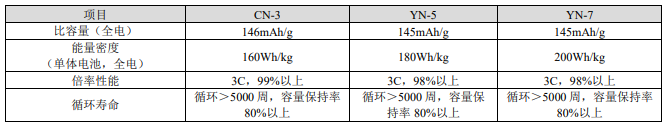 報(bào)告期內(nèi),湖南裕能所生產(chǎn)的磷酸鐵鋰包括多種型號(hào),其中以CN-3、YN5和YN-7為主,上述型號(hào)的磷酸鐵鋰做成電池后的主要性能如下: