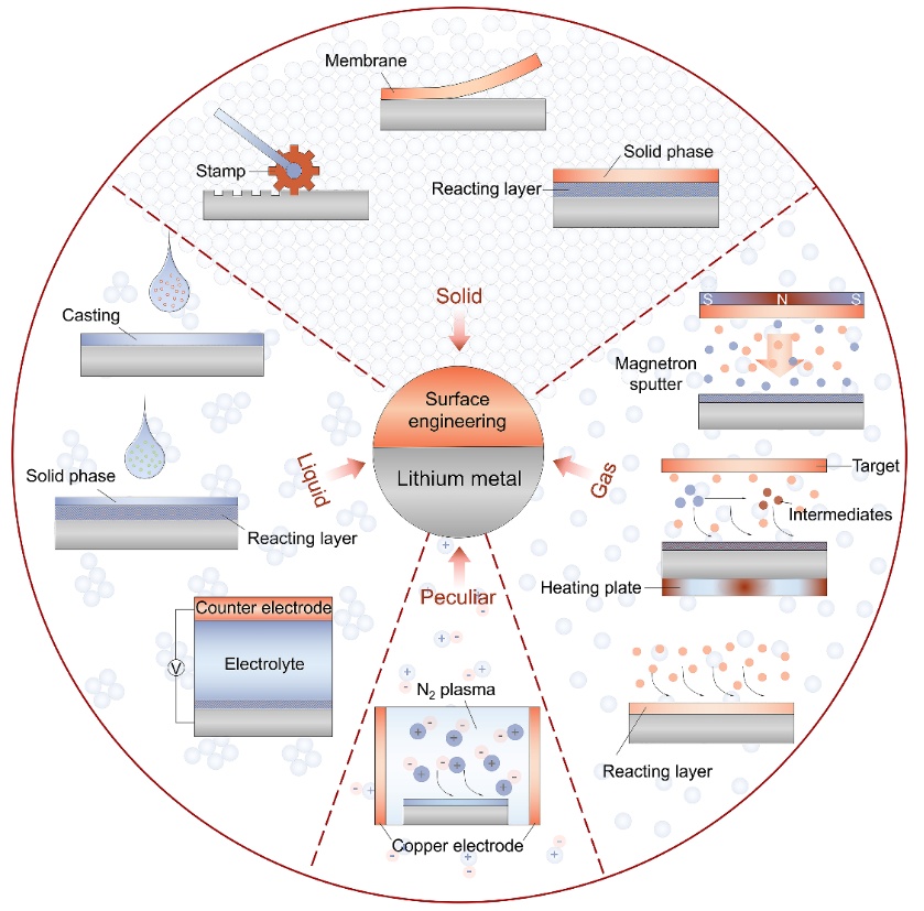 現(xiàn)代社會高度依賴高性能的電化學(xué)儲能系統(tǒng),用于便攜式電子設(shè)備和過渡到可再生能源和電氣化交通的電池受到了廣泛關(guān)注。金屬鋰由于其超高的理論比容量(3,860mAhg-1)、重量輕(6.94gmol-1)和最低的氧化還原電位(與標(biāo)準(zhǔn)氫電極相比為-3.04V)而被視為最有前途的電池負(fù)極材料。盡管有這些獨特的優(yōu)勢,鋰金屬電池(LMBs)的實際應(yīng)用仍然受到鋰枝晶生長的嚴(yán)重阻礙,導(dǎo)致循環(huán)性能差和安全問題。鋰枝晶通常是由不穩(wěn)定的固體電解質(zhì)界面(SEI)誘發(fā)的。為了克服電極/電解液界面的化學(xué)和機(jī)械不穩(wěn)定性,從而實現(xiàn)穩(wěn)定和高性能的鋰金屬負(fù)極(LMA),需要對SEI的組成和特性進(jìn)行精確控制。表面和界面工程在改善LMA的界面物化性質(zhì)與電化學(xué)性能方面發(fā)揮著關(guān)鍵作用,因為它具有構(gòu)建各種功能性人工SEI的強(qiáng)大能力。由于鋰金屬表面人工SEI的物理/化學(xué)性質(zhì)基本上是由預(yù)處理過程決定,因此用于表面工程的預(yù)處理材料的物質(zhì)狀態(tài)(固體、液體、氣體)值得仔細(xì)考慮。這是因為不同物質(zhì)狀態(tài)的前驅(qū)體將不可避免地影響人造SEI的結(jié)構(gòu)和引起界面物化性質(zhì)的變化。