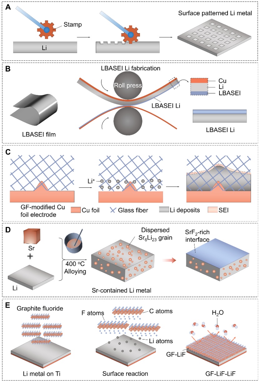 通過機(jī)械應(yīng)變在LMA表面形成圖案化,圖案化的表面可以降低金屬鋰表面的電流密度,并通過擴(kuò)大金屬鋰的表面積來減少電池運行時的鋰枝晶形成(圖2A)。