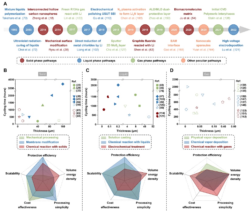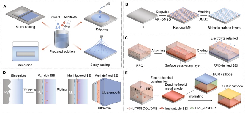包括浸泡、滴涂、刮刀和旋涂在內(nèi)的溶液澆筑法已被開發(fā)為一種簡便且可重復(fù)的方法,用于創(chuàng)建功能屏障層,以避免電解質(zhì)衍生的SEI的缺點(圖3A)。