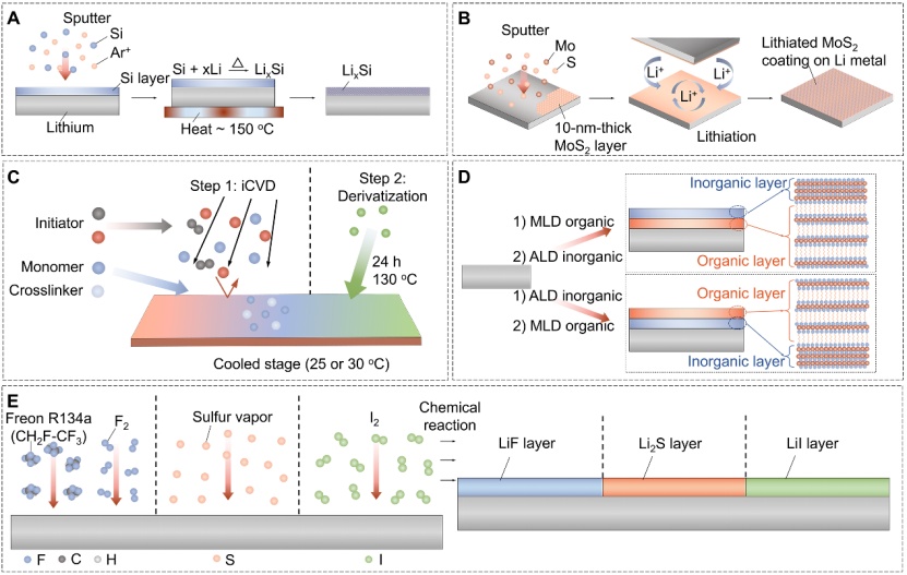 CVD方法是一種先進(jìn)的合成方法,在高溫下通過前體的化學(xué)作用在電極上直接生長超薄的薄膜。通過這種方法,可以在金屬鋰上實現(xiàn)原子層厚度的高度均勻和穩(wěn)定的保護(hù)膜。原子層沉積(ALD)是氣態(tài)前驅(qū)體和固體表面之間的一種自我控制的化學(xué)反應(yīng),它能以合理的設(shè)計和精確控制的成分和厚度實現(xiàn)良好的覆蓋和保形沉積。除了ALD之外,分子層沉積(MLD)通過用有機(jī)接頭或分子片段取代氧化前驅(qū)體在LMA表面的應(yīng)用也得到了進(jìn)一步發(fā)展(圖4C,D)。