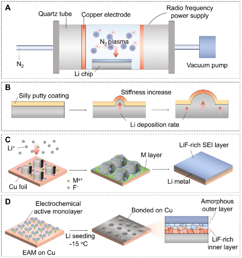 等離子體狀態(tài)經(jīng)常被稱為物質(zhì)的第四種狀態(tài)。通常,等離子體由高壓電離產(chǎn)生的極活潑的電子、離子和中性物質(zhì)組成。通過能量交換,等離子體試劑可以在材料表面迅速產(chǎn)生大量的活性點,使具有高壁壘的反應(yīng)在幾分鐘內(nèi)即可完成。例如,研究者通過在N2或CF4中對金屬鋰進(jìn)行等離子體活化,在LMAs上獲得了Li3N及LiF-Li2C2保護(hù)層。研究者們還提出了一些有趣的的策略,如結(jié)合不同的方法構(gòu)建多個保護(hù)層、“固液膜”、“緩釋膠囊”和“自組裝單分子層”等概念,用于在LMAs上創(chuàng)建穩(wěn)定的SEI層(圖5B-D)。