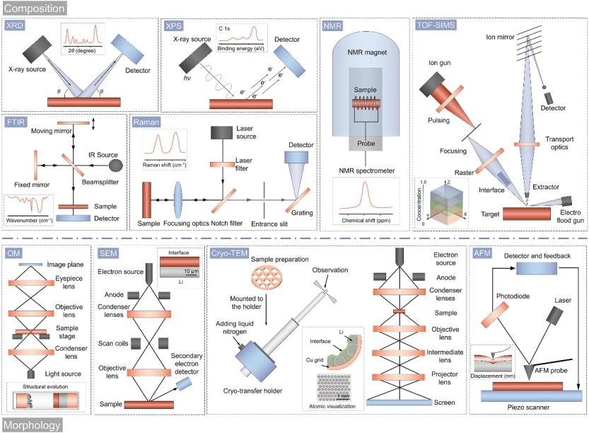 了解界面保護(hù)層的物理和化學(xué)特性對于理解LMAs的電化學(xué)行為非常重要。以下科學(xué)問題是LMAs表面研究中的主要關(guān)注點:(1)保護(hù)層的形態(tài)、粒度和厚度;(2)化學(xué)成分、元素含量和化學(xué)狀態(tài);(3)硬度和彈性模量;(4)多個空間尺度上的結(jié)構(gòu)演變。表征手段在理解這些科學(xué)問題方面起著關(guān)鍵作用(圖6)。