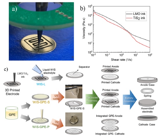 圖1.本工作中研究的WIS-GPE電池的制備過程。(a)LMO陰極電極的打印。(b)所制備的陰極和陽極油墨的流變學結果。(c)說明三種不同配置的打印電池及其相應的制備路線的示意圖。
