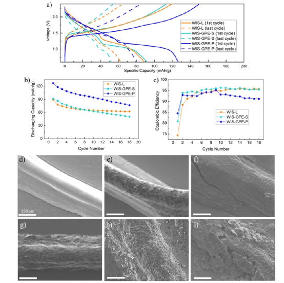 這可能是由于WIS-GPE在循環(huán)過程中膨脹并填充電極孔隙,或WIS-GPE的降解和體積變化,然后促成了形態(tài)上的演變。裂縫的形成可能導致容量損失,這與在兩種類型的WIS-GPE電池中觀察到的較低的庫侖效率相一致,與WIS-L電池相比。