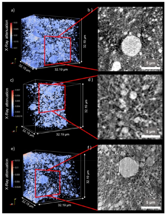 圖3.三維X射線納米斷層分析顯示了打印的LMO電極的三維體積渲染(a,c,e)及其相應的假橫斷面圖像(b,d,f):(a,b)原始的LMO電極;(c,d)在液體WIS電解質中循環(huán)的LMO電極,和(e,f)在WIS-GPE-S中循環(huán)的LMO電極。