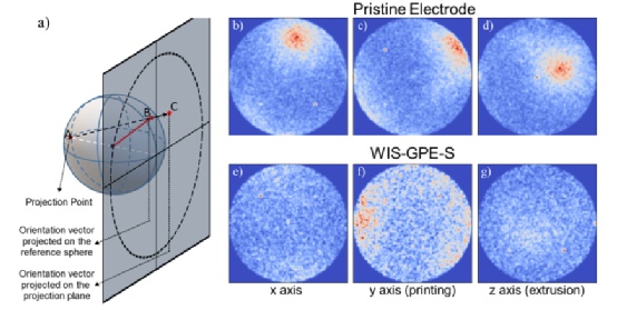 圖5.打印的TiS2電極沿不同軸線的界面正態(tài)分布:(a)IND分析的概念,(b-d)原始電極,和(e-g)在WIS-GPE-S中循環(huán)的電極。