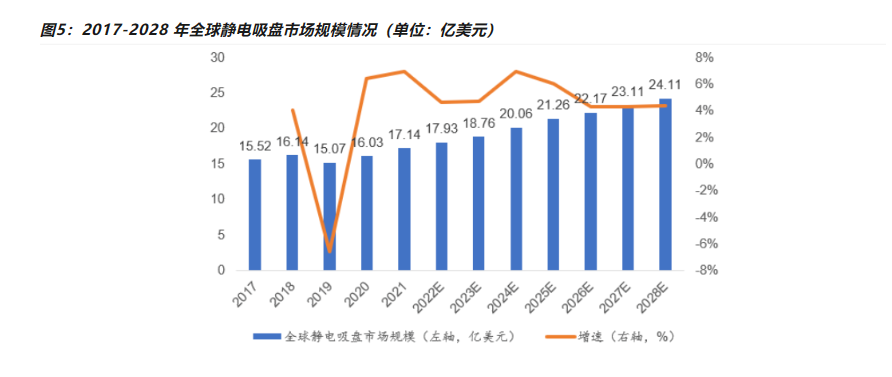 根據(jù)QYResearch的數(shù)據(jù),2021年全球靜電吸盤市場銷售額為17.14億美元,預(yù)計(jì)2028年將達(dá)到24.12億美元,2022-2028年復(fù)合增長率為5.06%。從銷量上看,2021年全球靜電吸盤銷量為5.54萬件,預(yù)計(jì)2028年將達(dá)到7.99萬件。