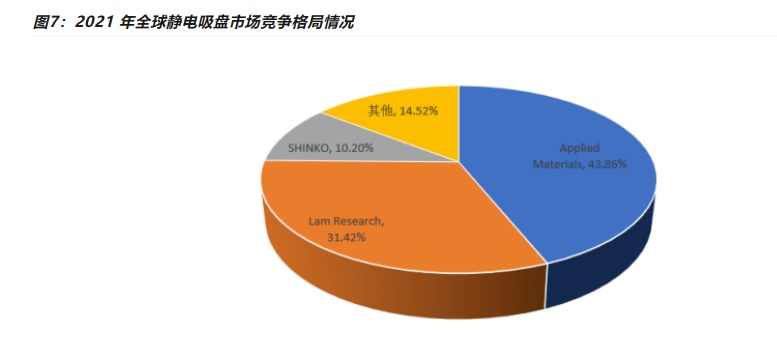 全球靜電吸盤市場高度壟斷,由日本和美國企業(yè)主導(dǎo),集中度較高,全球前五大制造商市占率超過80%。主要廠商包括美國Applied Materials、美國Lam Research、日本SHINKO、日本TOTO、日本NTK等公司,其中Applied Materials和Lam為自己的半導(dǎo)體設(shè)備配套生產(chǎn)靜電吸盤,它們將生產(chǎn)的刻蝕、PVD、CVD等設(shè)備配套靜電吸盤一起銷售給晶圓廠,由于靜電吸盤屬于消耗品,使用壽命一般不超過兩年,因此靜電吸盤具有較大的替換市場。