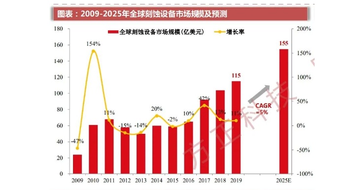 近年來,5G、AIoT等新興技術(shù)合力推動(dòng)下,產(chǎn)業(yè)智能化進(jìn)程加速,下游應(yīng)用市場(chǎng)需求迸發(fā),拉動(dòng)著全球半導(dǎo)體需求放量上漲,反向驅(qū)動(dòng)上游半導(dǎo)體制造設(shè)備需求和技術(shù)更迭。據(jù)方正證券報(bào)告預(yù)計(jì),全球晶圓制造設(shè)備(WFE)市場(chǎng)規(guī)模將達(dá)到850億美元量級(jí)。SEMI預(yù)測(cè)2025年全球刻蝕設(shè)備市場(chǎng)規(guī)模將增長(zhǎng)至155億美元(約合超1000億元),CAGR約為5%。