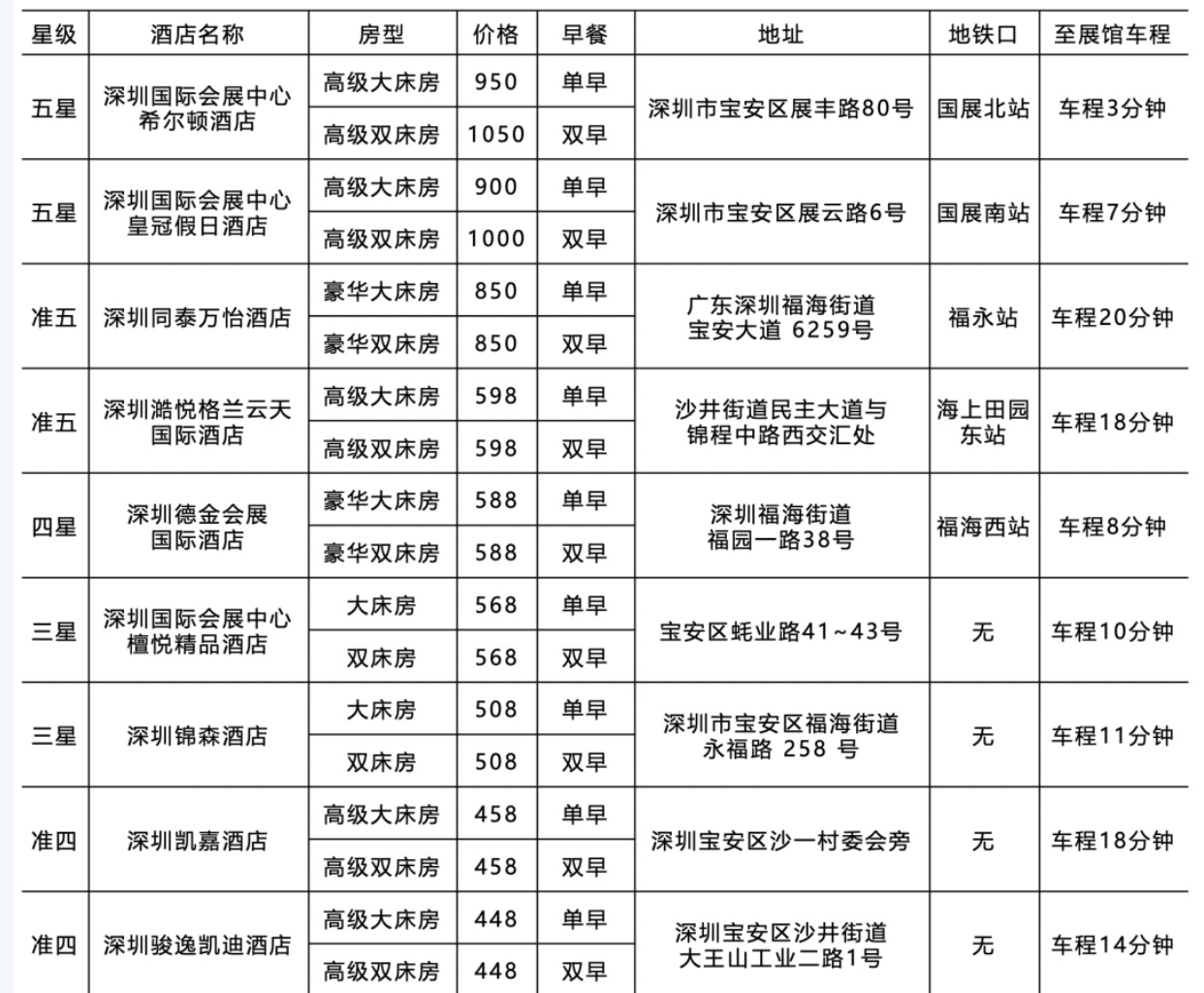 展會期間,附近的酒店都很搶手,建議您一定要提前預(yù)訂。您也可以聯(lián)系本次展會的指定接待商,獲取返程機(jī)票、酒店預(yù)訂及租車、商務(wù)旅游及其他展會解決方案等服務(wù)。