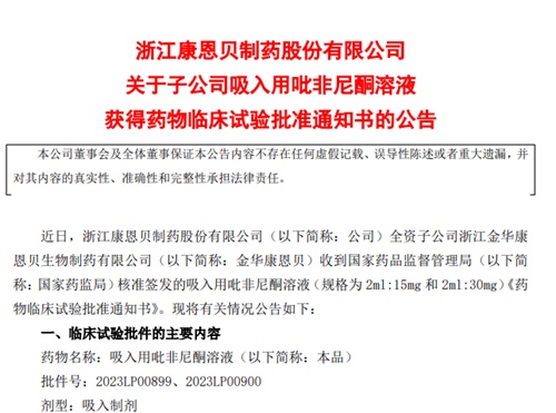 中國粉體網(wǎng)訊 近日,康恩貝發(fā)布公告稱,浙江康恩貝制藥股份有限公司(“公司”)全資子公司浙江金華康恩貝生物制藥有限公司(金華康恩貝)收到國家藥品監(jiān)督管理局核準(zhǔn)簽發(fā)的吸入用吡非尼酮溶液(規(guī)格為2ml:15mg和2ml:30mg)《藥物臨床試驗批準(zhǔn)通知書》。