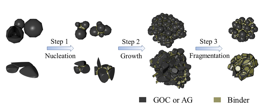 針對(duì)這一問題,北京化工大學(xué)宋懷河教授課題組在《新型炭材料》(New Carbon Materials,2022,37(2),402-411)上發(fā)表研究論文“A wet granulation method to prepare graphite particles with a high tap density for high volumetric energy density lithium-ion storage”。該文報(bào)道了一種通過濕法制粒制備高振實(shí)密度石墨顆粒的簡(jiǎn)單方法。通過高剪切濕法制粒技術(shù)將石墨化洋蔥碳(GOC)和人造超細(xì)石墨(AG)致密成球型大顆粒(WG-GOC、WG-AG),見圖1。所制備石墨顆粒具有較高的球型度和致密度,能有效地提高材料振實(shí)密度,并獲得了高體積比容量。