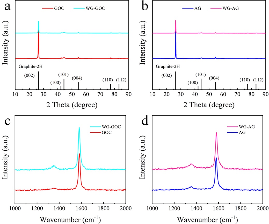 造粒前后材料的結(jié)構(gòu)表征如圖2所示。黏結(jié)劑的加入并沒有破壞原料石墨的結(jié)構(gòu)特征,造粒后的石墨顆粒保持原有的高石墨化度,石墨材料的電化學(xué)特征得以保留。